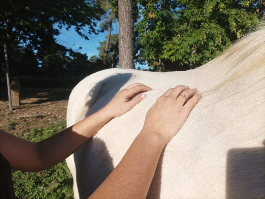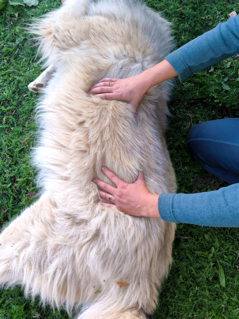 A l’issue de cette observation, je commencerai le soin. Celui-ci comprend des pressions de doigts, et des étirements, lorsque cela est possible. Il peut m’arriver de travailler sans toucher physiquement l’animal, au niveau d’une zone douloureuse par exemple.
